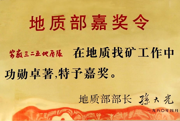 1980年4月,北京召开全国地质系统评功授奖大会,325地质队获地质部颁发嘉奖令,荣获“功勋地质队”称号。